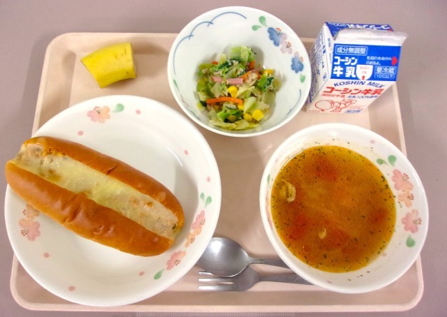 【本日の献立】 チリビーンズチーズドッグ、牛乳、人参のオニオンドレッシングサラダ...