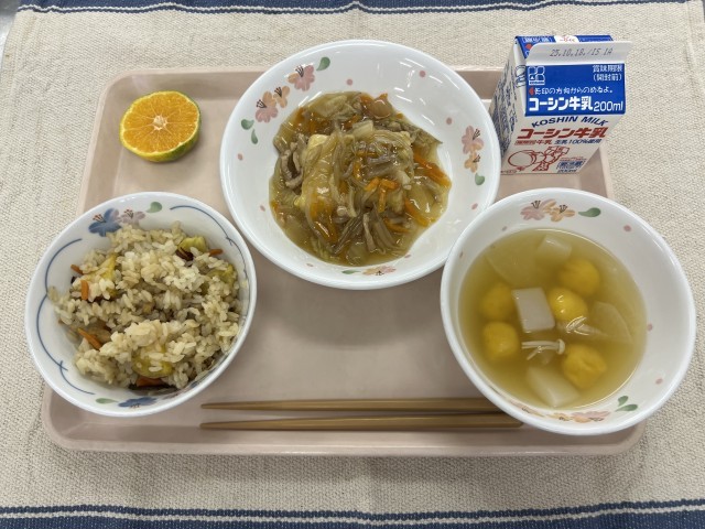 10/7(火) 今日の給食 公開日 2025/10/07 更新日 2025/10/07 学校日記 吹き寄せごはん揚げ出し豆腐の野菜あんかけかぼちゃ白玉汁みかん本日は昨日の十五夜に合わせた、お月見献立です。