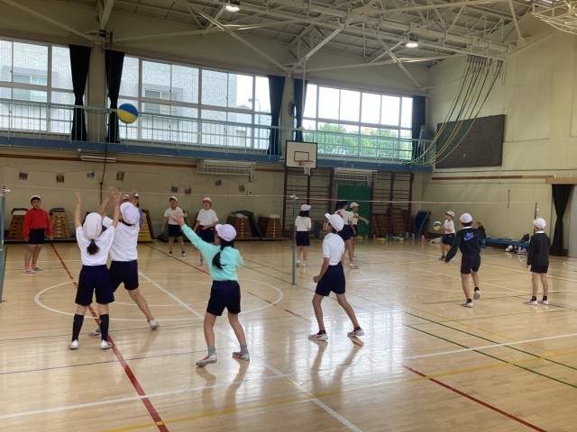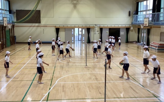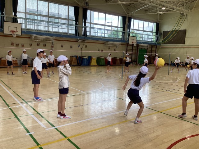 体育館体育では、キャッチバレーボールをやっています。パスを3回つなげて、最後に攻撃をします。味方からのパスを、コートのどの位置でもらうと攻撃しやすいのかを、各チームで考えながらゲームをしています。