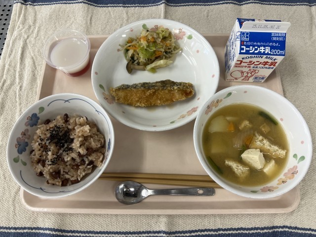 10/31(金) 今日の給食 公開日 2025/10/31 更新日 2025/10/31 学校日記 お赤飯鮭のあずま煮小松菜としめじのおひたしじゃがいものみそ汁紅白寒天明日の開校記念日に合わせて、お赤飯を炊きました。紅白寒天は白にカルピス、赤にクランベリージュースを使用して作りました。