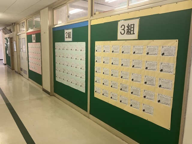 職員室前の廊下に2年生の学習発表会に向けてのめあてが掲示されています。会場入場前等にぜひご覧ください。
