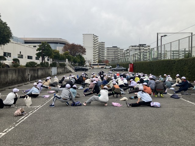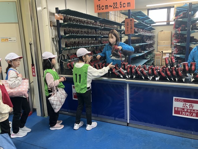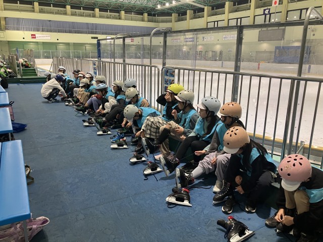今日は4年生のスケート教室です。準備運動をしてスケート靴を履いて準備完了しました。