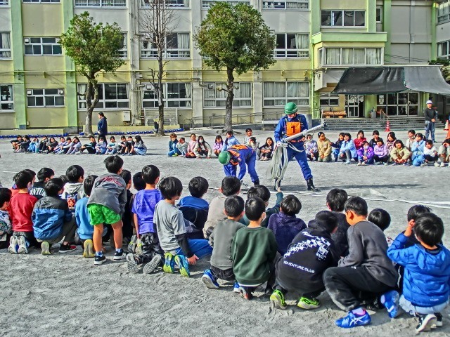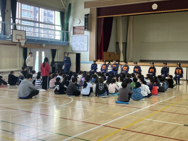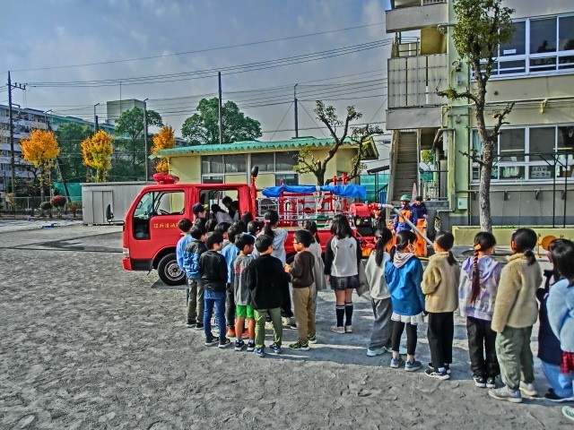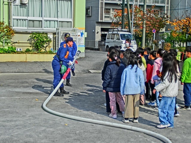 3年生が消防団の方に来ていただき社会科の学習をしました。放水の様子を実際に見せていただき、質問にも答えていただきました。お忙しい中子供たちのためにありがとうございました。