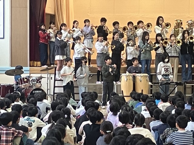 金管バンド集会が開かれました。金管バンドクラブのみんなが今まで練習してきた成果を発表してくれて大きな拍手に包まれました。