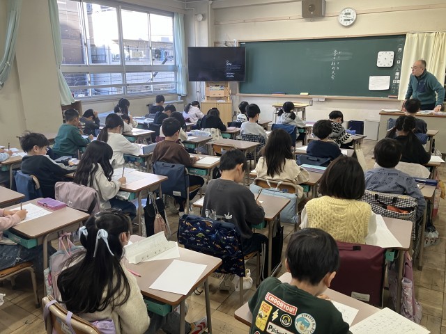 1年生と2年生は教室で書き初めに取り組みました。一文字一文字ずつ丁寧に書きました。