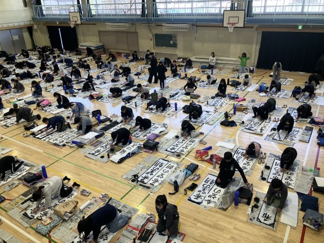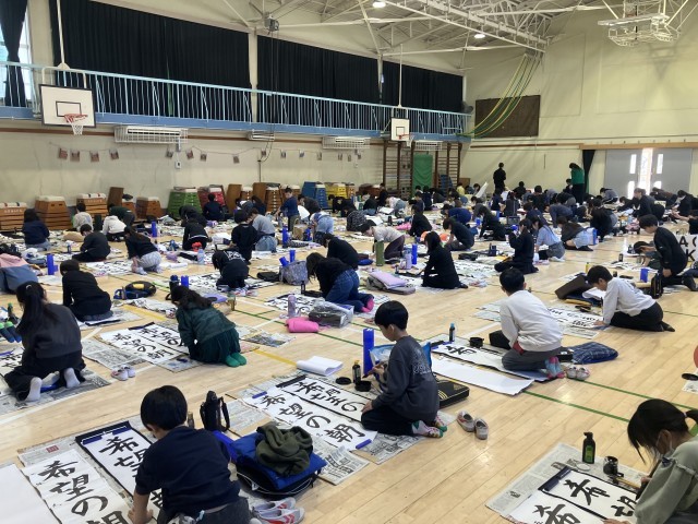 3年生に続いて5年生も体育館で書き初めを行いました。二学期、冬休みの練習の成果が出そうと集中して取り組んでいました。