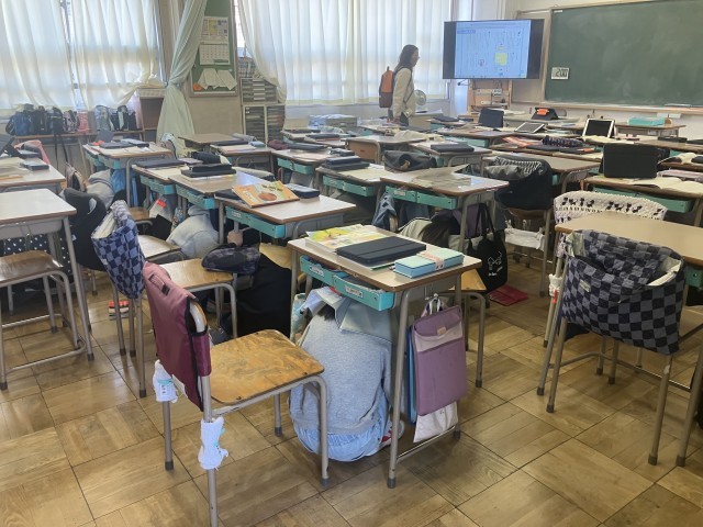 今日はJアラートが発令されたという想定で避難訓練を行いました。教室内での避難後、建物の中にいる時や外にいる時の対応方法について学習しましたので、お子さんに確認してみてください。