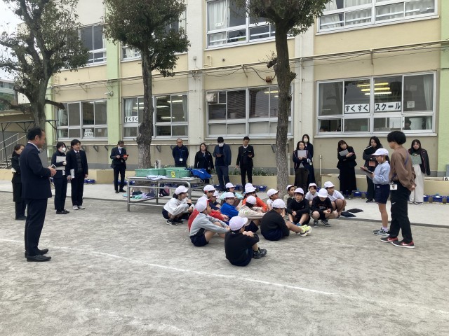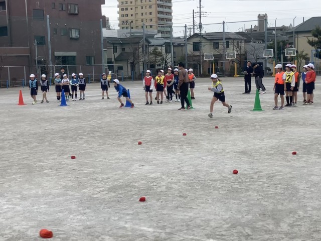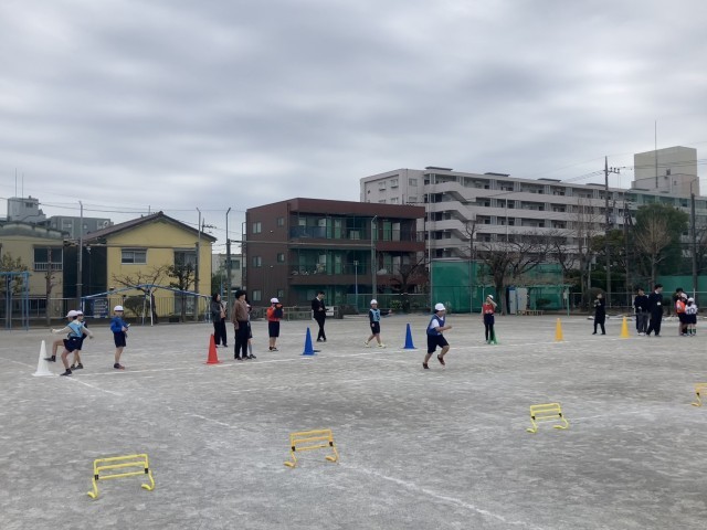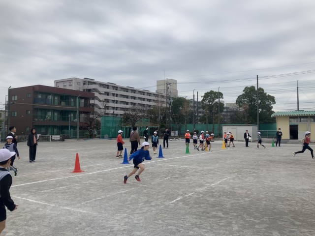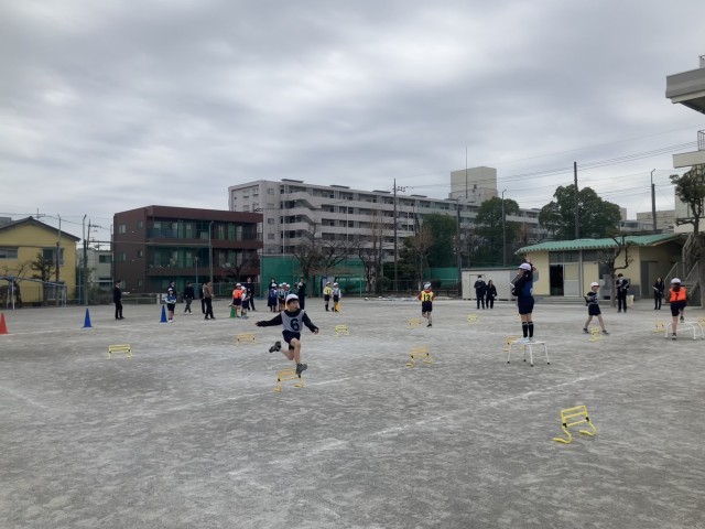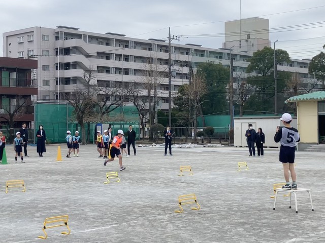 4年3組で校内研究の研究授業がありました。とても寒い中でしたが、子供たちはハードル走に全力で取り組みました。