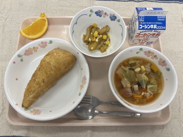 2/17(火) 今日の給食 公開日 2026/02/17 更新日 2026/02/17 学校日記 手作りメープルパンサーモンと豆のスーププーティン(チーズポテト)オレンジ今日は世界の料理カナダです。プーティンはフライドポテトに、グレイビーソースとチーズをからめた料理です。特産品のメープルやサーモンも使った献立にしました。