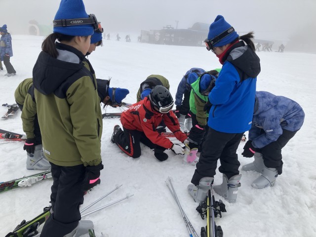 さっそくグループに分かれてスキースクールの始まりです。まずはブーツの履き方から教わりました。