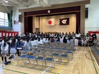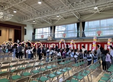 2月20日に行った「6年生を送る会」では、1年3組が学級閉鎖になっていたため、1年生からの出し物を6年生に披露することができませんでした。そこで、3/9に1年生と6年生だけで「6年生を送る会」を行いました。