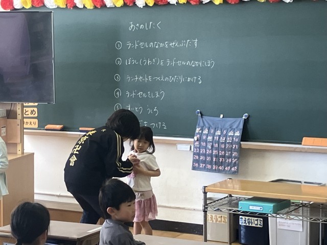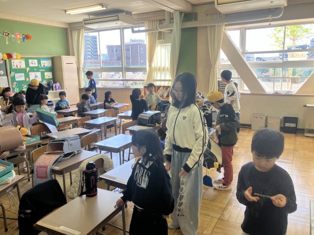 新学期が始まってしばらくの間は6年生が1年生の朝の準備を手伝ってあげています。