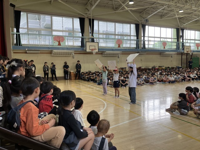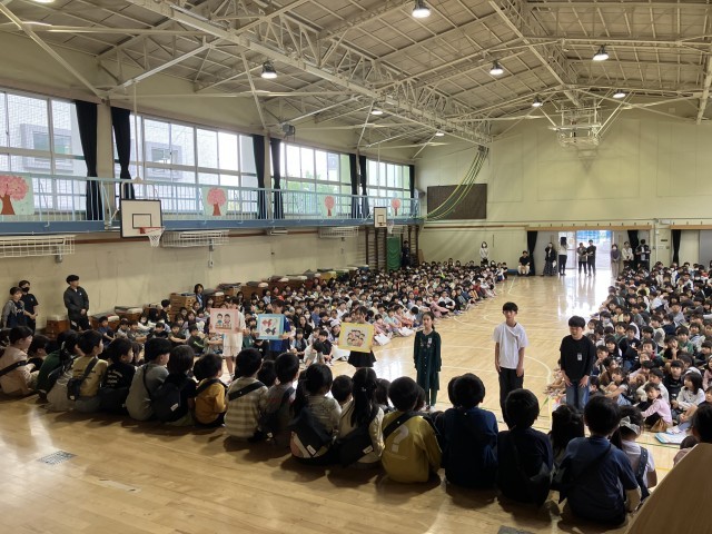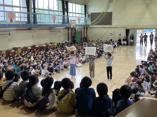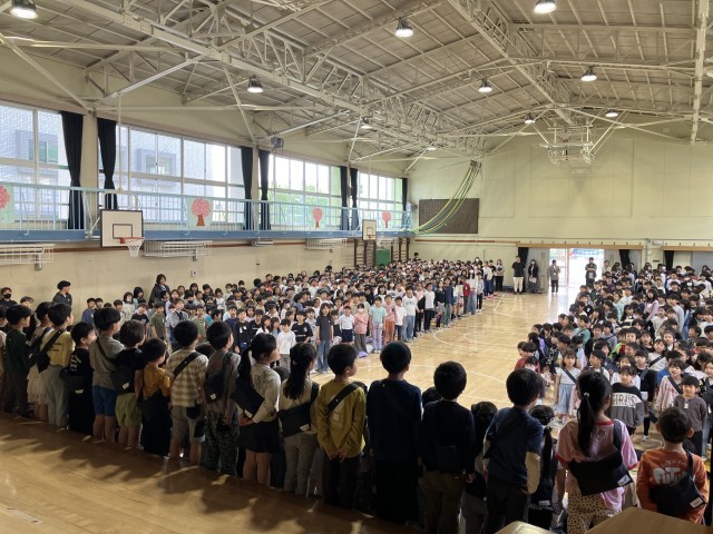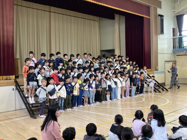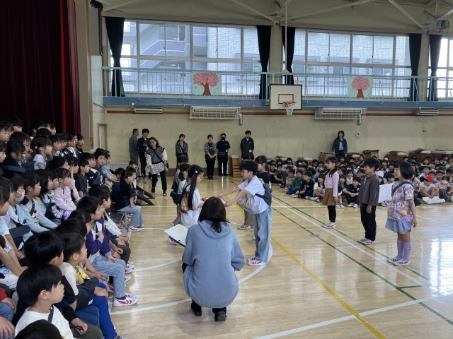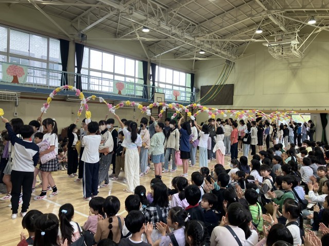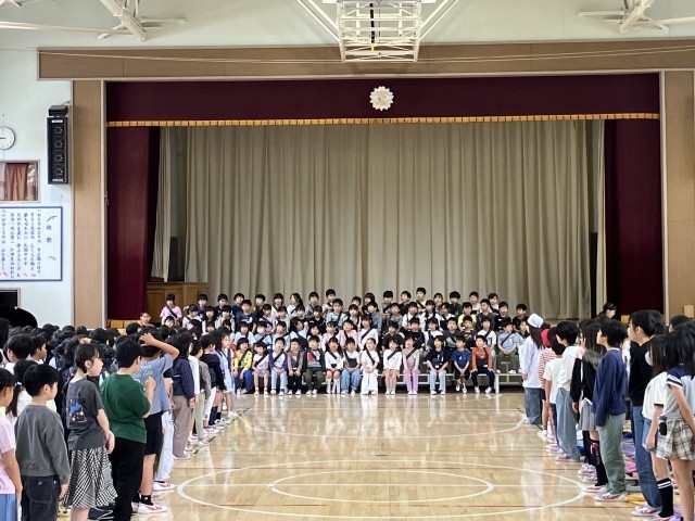 1年生を迎える会が開かれました。1年生は5年生が作った花のアーチを6年生と手を繋いで歩いて入場し、2年生からプレゼントをもらい、3、4年生の学校紹介クイズに取り組み、最後にみんなで「さんぽ」を歌って楽しい会となりました。
