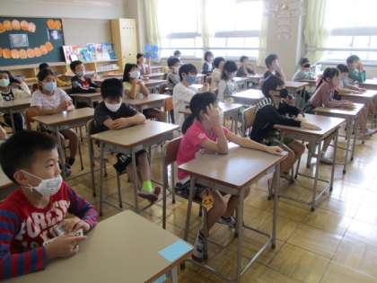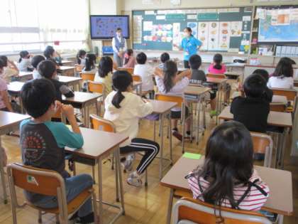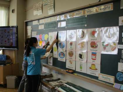 3年生が担任の先生、ALTと一緒に外国語の授業に臨んでいます。黒板に貼られた、沢山のカードを活用しながら、「What do you like?」「I like 〇〇.」の表現に慣れ親しんでいました。音声だけだと難しくても、視覚で捉えられる教具があるから、子供たちにとっては心強いはずです。