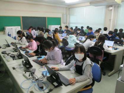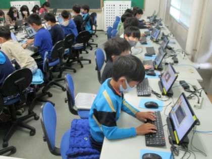 1校時が終わり、退室した1年生と入れ替わりに今度は、3年生が活動しているパソコンルームです。ICT活用の推進に伴い、利用率がとても高くなっている教室です。