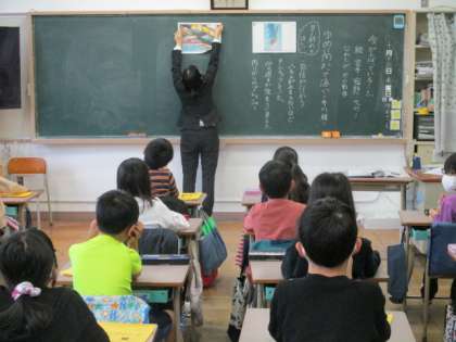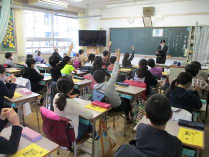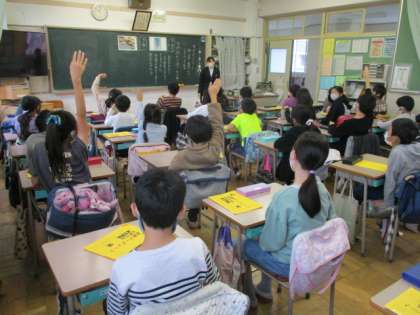 あらかじめ用意しておいた絵を提示しながら、自己関与させたい場面について発問しています。これがあるかないかだけでも、子供たちの思考には大きな差が生じるものなのです。(最近は、テレビで見せることも多くなっています)