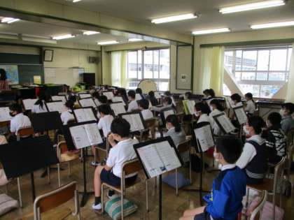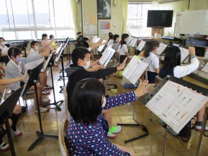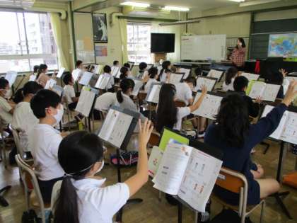 「 和音のはたらきを感じ取ろう」というめあてに向かい、子供たちは先生の解説を静聴しています。そして、いよいよ実践。先生が発した和音に傾聴します。キャッチできた子は声を出さずに、ハンドサインで聴きとった番号を発表していました。