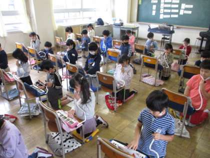 「ぴょんぴょこロックンロール」の楽譜に音を記入し、確認が終わったとき、先生が「鍵盤、やるよ」と発しました。すると、それに対する子供たちのリアクションが、まぁ嬉しそうなこと! やりたくて、たまらなかった感が、あふれんばかりでした。2年生の食いつきの良さは、きっと技能にも反映されていくことでしょう。