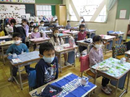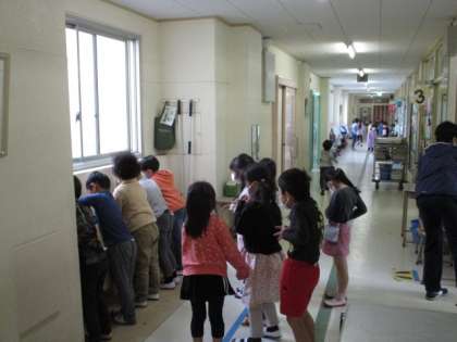 給食準備中の様子をウォッチングしに、1年生の教室を巡ってみたら、会う子、会う子、実によく挨拶ができていました。「こんにちは」の挨拶シャワーを全身に浴びて、2階をあとにしたのでした。嬉しい誤算と言えばよいでしょうか。