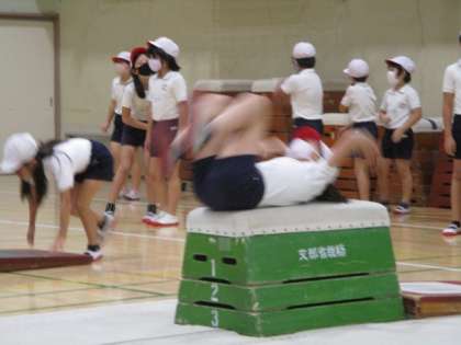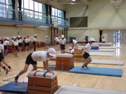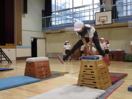 跳び箱運動に取り組んでいるのは4年生です。開脚跳び、台上前転にトライしています。みんな一生懸命に。