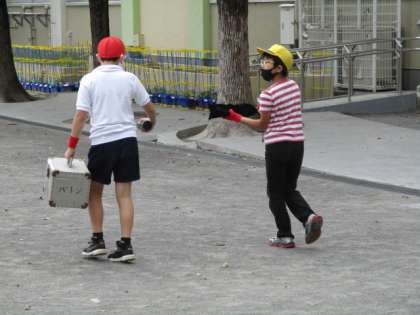 用具、機器の用意を先生一人でしていたら、えらいこっちゃな話です。子供たちの手を借りたくても、低学年児童には委ねられない仕事も現実あります。しかし、高学年のみんなだったら、お願いしても大丈夫! という訳で、先生の力になっていた、頼もしい諸君をキャッチしたショットです。ありがたや。
