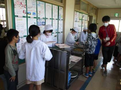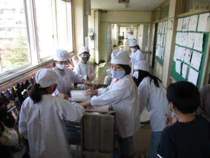 せっせと準備に励む当番の子、手洗いを済ませ着席する子、子供たちの行動パターンは大きく2通りですが、みんなに共通していたのは、自主的な挨拶が多いこと、多いこと。爽やかに弾む声に、午後の活力をいただいた思いがしました。