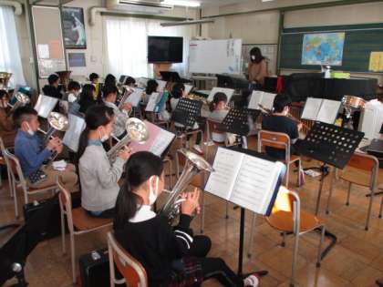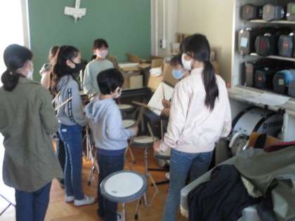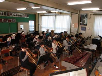 トロンボーン、アルトホルン、チューバ、打楽器を担当するメンバーが集まっています。3グループ制に分けて行っている朝練習、これで全てのグループ紹介が終わりました。