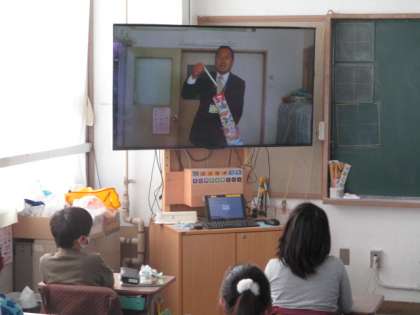 千歳飴を手にした校長先生より、昨日の七五三を取り上げたお話がありました。