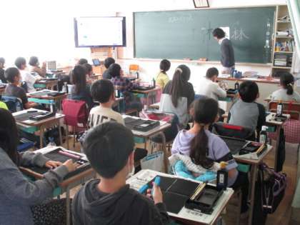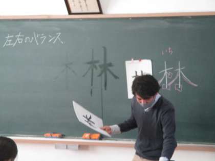 本日の毛筆は「林」が課題文字のようです。先生が墨の代わりに、手本を水書しています。しかも、担任姓の一文字ときた。左右のバランスが大事です。さすが、うまい! 4年生から、すかさず起こる拍手。きっと、いつもより上出来な作品が増えそうですね。