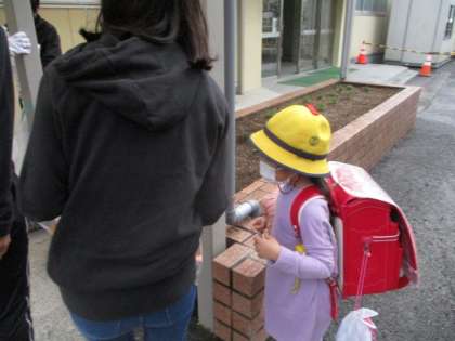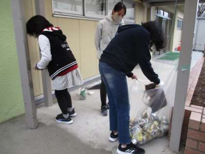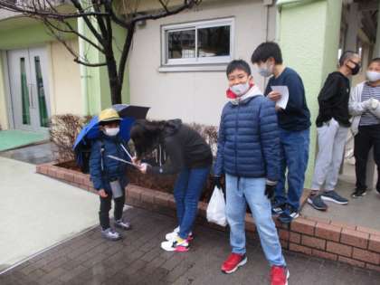 傘をさしながらの登校にもかかわらず、もう一方の手にはアルミ缶が入った袋を提げた子がいるアルミ缶デーの朝です。