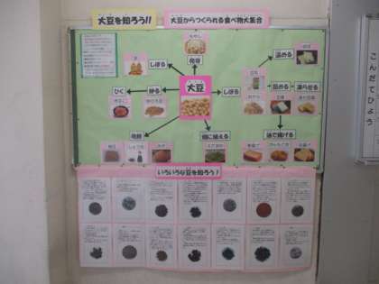 大豆以外にも、お豆の種類はたーくさん! 給食室前で、学んでみましょう。