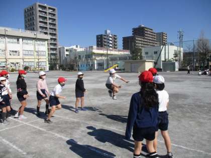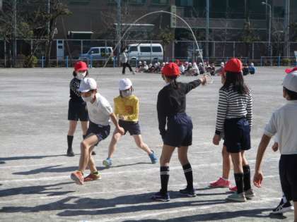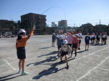 4校時の校庭では、4年生が長なわとびを練習していました。記録を伸ばすためには、跳び方だけでなく、なわを回す子のスキルをあげていくことも必要であり、重要な役と言えます。