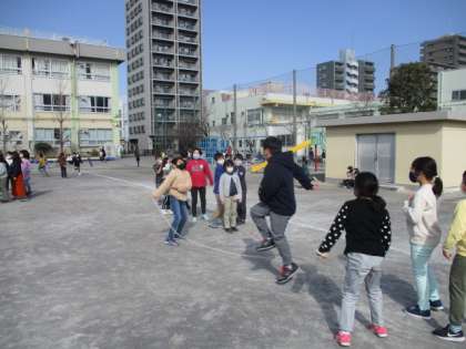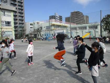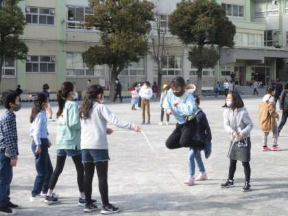 昼休みも、8の字跳びに興じるクラスがたくさん。4年生の様子です。