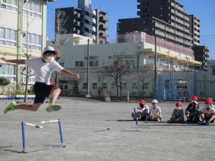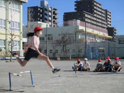 1校時、ハードル走に取り組んでいたのは5年生です。寒いけれど、のびのびと活動しており、すがすがしさが全開です。