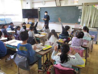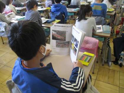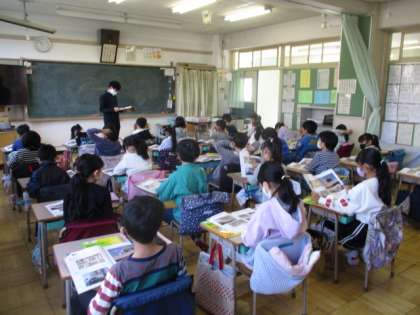 「オリンピックパラリンピック2020」本を活用しながら、2年生が競技について学んでいます。先生の体験談も交えて解説されていたので、子供たちは親近感をもって耳を傾けていました。