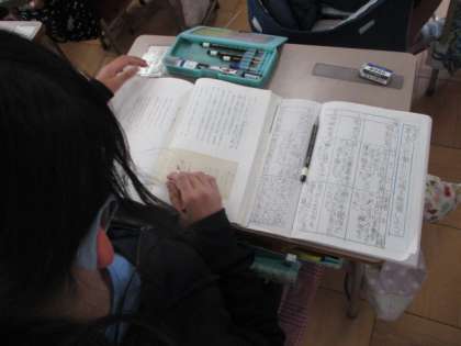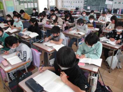 国語科「みすゞさがしの旅」を続ける子供たちの教科書やノートに目を投じると、高学年らしい学習の足跡がくっきりと。必要な箇所に色つきのサイドラインが引かれていたり、読解してきた内容が整然と記入されていたりします。
