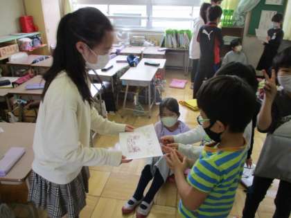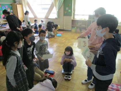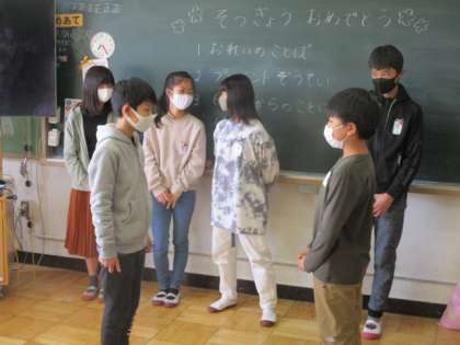 令和2年度ラストとなるいちにタイムです。6年生とのお別れセレモニーからスタートしました。中学年がお礼の言葉を伝えたり、低学年がメッセージカードを渡したりしています。