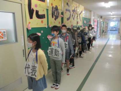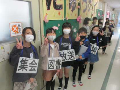 本日の集会に出演するメンバーが、8時の職員室前にズラリ。緊張しているのかと思いきや、カメラを向けるとご覧の通り。どこかウキウキな感じが漂っていました。この雰囲気なら、リラックスして乗り切れそうですね。
