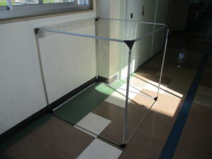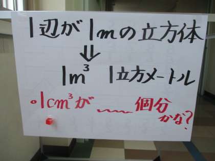 3階廊下に、物体が出現。さて、何でしょう? 5年生が算数科で学習している体積を可視化した実物を通して、子供たちが実感を伴った理解をしてくれたら本望です。