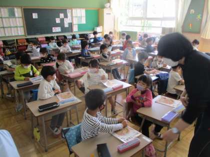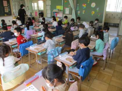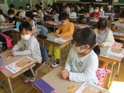 6の構成に数の学習が進んでいる1年生です。目の前にある6個のブロックから何個かを手で隠し、残りを相手に見せて、答えさせていくペア学習が行われていました。一瞬にして、隠されている数がひらめくようになればしめたもの。