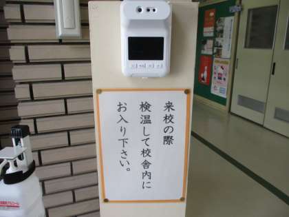 ご用のために校舎内へ入られる際には、職員玄関付近に用意してあります、アルコール消毒液と非接触型の体温計をお使いください。