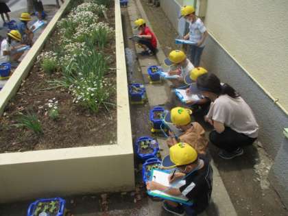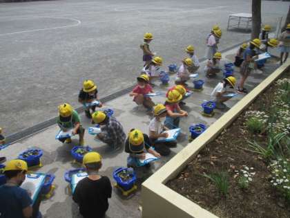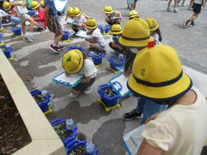 たんけんボードを提げたみんなが、カードにスケッチをしていました。