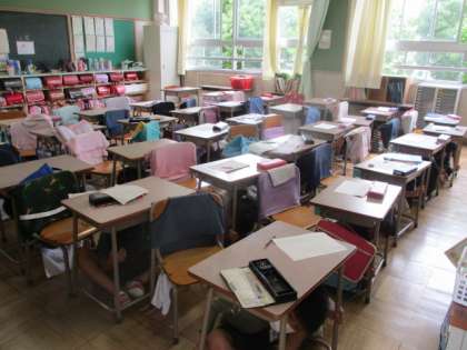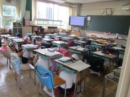 緊急地震速報が流れた際の対応について訓練をしました。すぐに身を隠し、安全な体勢を取らなければなりません。まるで誰もいない教室であるかの如く。
