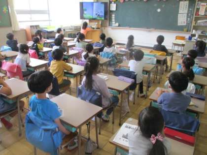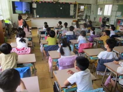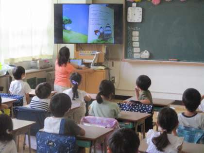 本の挿絵を大きく提示しながら、お話の読み聞かせが行われていた1年生の教室です。一カ所にみんなを集めることができないため(本来はそれが理想)、それぞれの席で聞いていました。