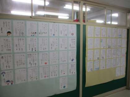 職員室前を通るたび、目を奪われます。本校のあいさつ標語として正式採用したくなるような、4年生のすてきな作品を、全員分読ませてもらいました。子供たちは、あいさつが心を元気にしたり、心と心が通い合うツールになったりすることを、実感しているのだと分かりました。