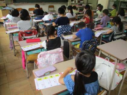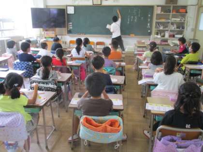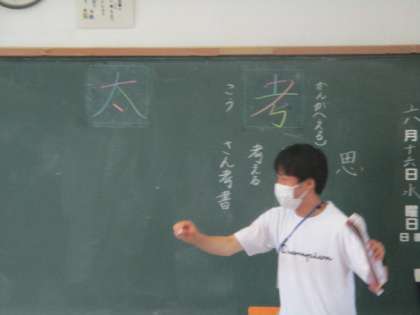 新出漢字の練習をしていたのは2年生です。習った字を使った言葉や文作りも行いました。「考」について終わり、次は「太」が登場です。先生が書き順を黒板で示し終わった瞬間、子供たちから実感たっぷりに「上手」というほめ言葉と拍手! 喜びつつも照れくさそうな担任でした。いいね。