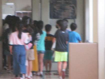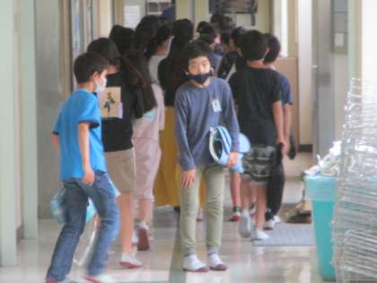 教室から理科室への教室移動で、最初はうまくいかなかった模様です。やり直して、リベンジを図ろうとしているところを、3階で遠目にしました。でも、おもむろにカメラを向けてしまうと、「見られているから頑張ろう」になりかねません。そこで、私はその場から姿を消し、1階へ先回り。子供たちの目につきにくそうなポジションでスタンバイすることにしました。
