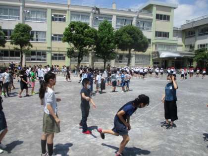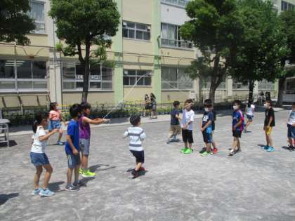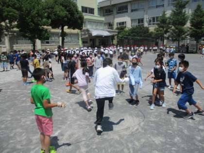 長なわ8の字跳び、短なわとびをしました。子供たちにまじって跳んだり、跳び方や走り抜けるコースをアドバイスしたり、先生方も大童です。