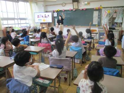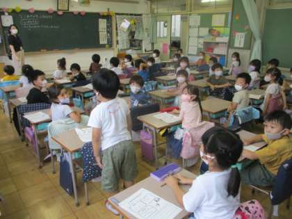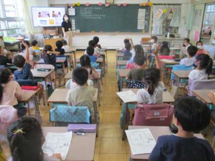 生活科「水であそぼう」の活動を終え、教室に戻った1年生は、振り返りを行っていました。一人一人が気付いたり、考えたことを全体で共有し、しゃぼん玉作りをただの遊びに帰着させてはいません。