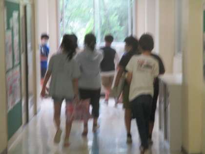 職員室前ですれ違う先生方に、子供たちが「こんにちは」を発する声が、聞こえてきました。すごく朗らかなトーン。誰だろう? 私が廊下へ見に行ったときには、家庭科室から教室へ戻るサブリーダーたちの後ろ姿が見えるばかりでした。(大慌てで撮影したから、画像はこの有様です)